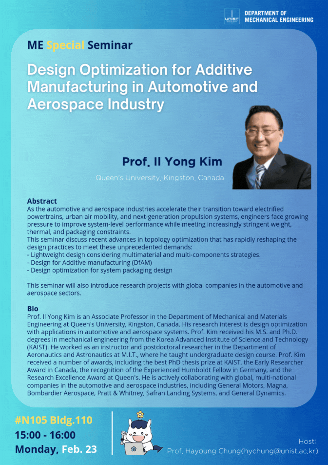 Main News Queen’s University 김일용 교수님 세미나 February 20, 2026 Queen’s 대학교 김일용 교수님을 모시고 “Design Optimization for Additive Manufacturing in Automotive and Aerospace Industry” 주제로 초청 세미나를 진행하였습니다.